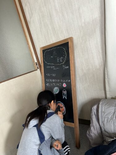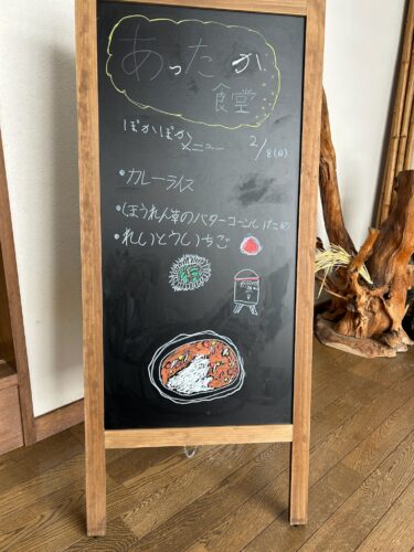 本日は、美味しいカレーライスが主食でした!あと、ほうれん草のバターコーン炒めを調理して頂きました。ボランティアの皆様ありがとうございました。また、今回は、お子さんがお手伝いして下さり、メニューの看板も書いてくれました!