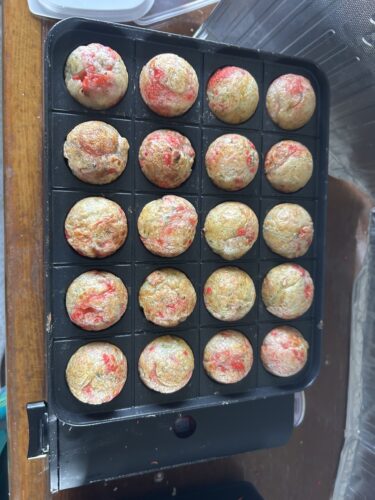当日は、45名の予約でしたので、400個を目標に焼きました。焼き機は4台(20個/1台)でしたので1人5クールで100個焼きました!